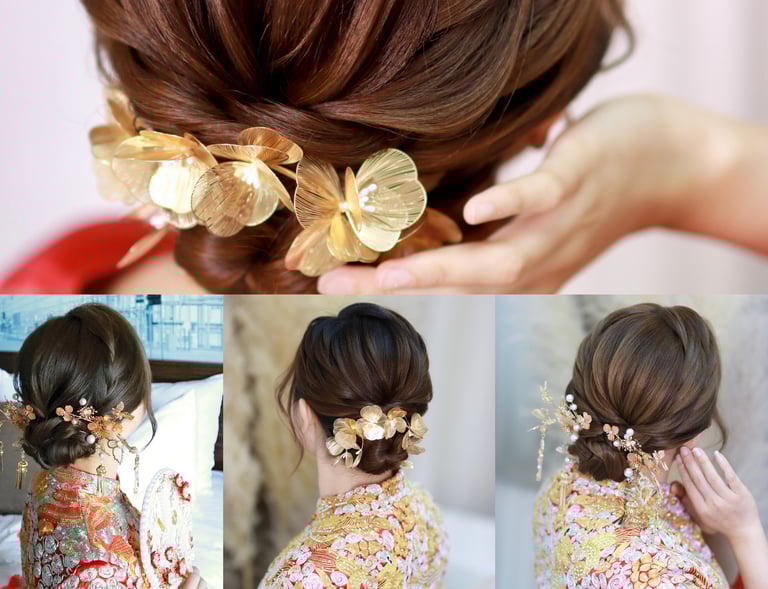 線條感低髮髻:教學主要重點在於如何做出飽滿線條感, 以及扭髮髻手法。適用於中式裙褂造型。