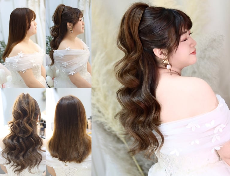高馬尾:教學重點在於如何打造不易鬆散、營造豐富髮量嘅高馬尾。適用於外影/迎賓/敬酒造型。