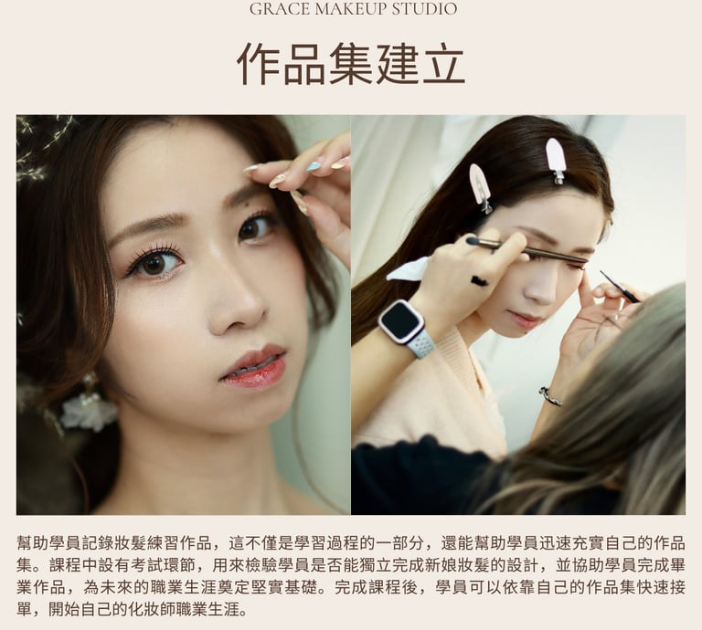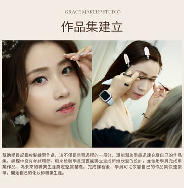 幫助學員記錄妝髮練習作品,這不僅是學習過程的一部分,還能幫助學員迅速充實自己的作品集。課程中設有考試環節,用來檢驗學員是否能獨立完成新娘妝髮的設計,並協助學員完成畢業作品,為未來的職業生涯奠定堅實基礎。完成課程後,學員可以依靠自己的作品集快速接單,開始自己的化妝師職業生涯。
