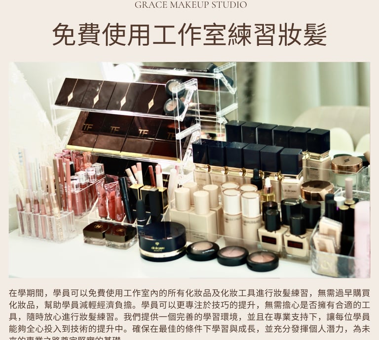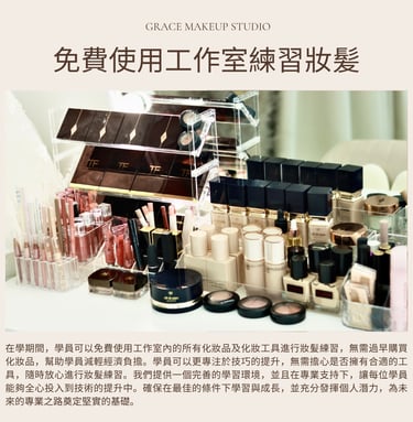 在學期間,學員可以免費使用工作室內的所有化妝品及化妝工具進行妝髪練習,無需過早購買化妝品,幫助學員減輕經濟負擔。學員可以更專注於技巧的提升,無需擔心是否擁有合適的工具,隨時放心進行妝髮練習。我們提供一個完善的學習環境,並且在專業支持下,讓每位學員能夠全心投入到技術的提升中。確保在最佳的條件下學習與成長,並充分發揮個人潛力,為未來的專業之路奠定堅實的基礎。