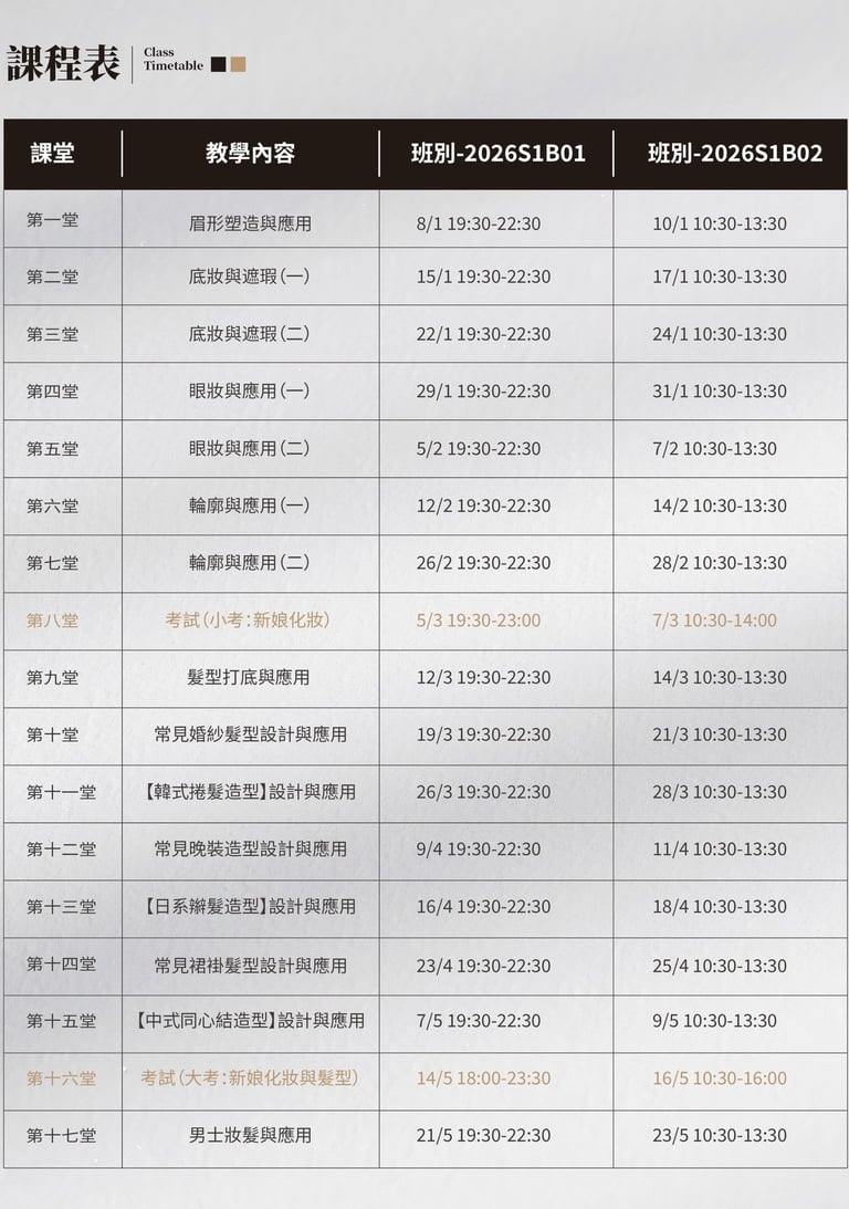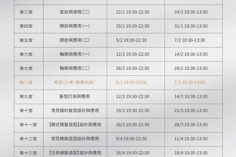 課程將帶領學員掌握新娘妝髮的核心技巧,幫助學員為每位新娘量身定制完美的妝容與髮型。學員將學習如何打造精緻的底妝,使妝容持久無瑕,讓新娘整個婚禮過程中無需擔心脫妝問題;學會如何根據新娘的五官特徵、髮質以及婚禮主題設計出專屬的婚禮妝容,讓每位新娘都能展現最美的一面;還有如何設計適合不同婚禮風格的髮型,無論是浪漫的波浪卷還是典雅的盤髮,都能游刃有餘,為新娘增添光彩。