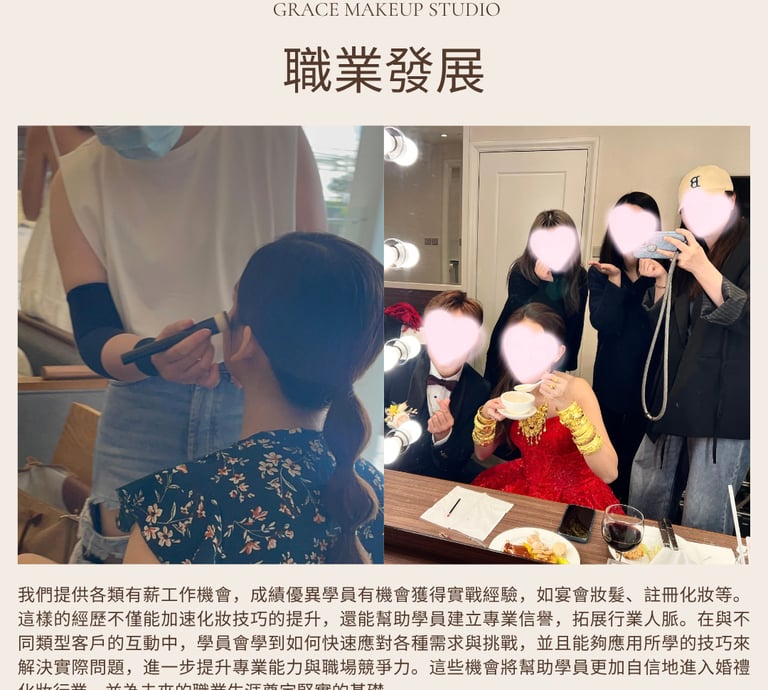 我們致力於培養專業化妝師,表現優異者有機會成為GRACE MAKEUP STUDIO的正式團隊化妝師,獲得有薪工作機會,參與婚禮化妝、廣告拍攝、寫真拍攝及宴會化妝等多元項目,開啟穩定且多面向的職業生涯。我們目標是助力學員從實習到就業無縫銜接,成為行業中備受推崇的專業化妝師。
