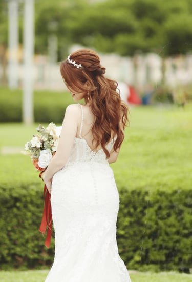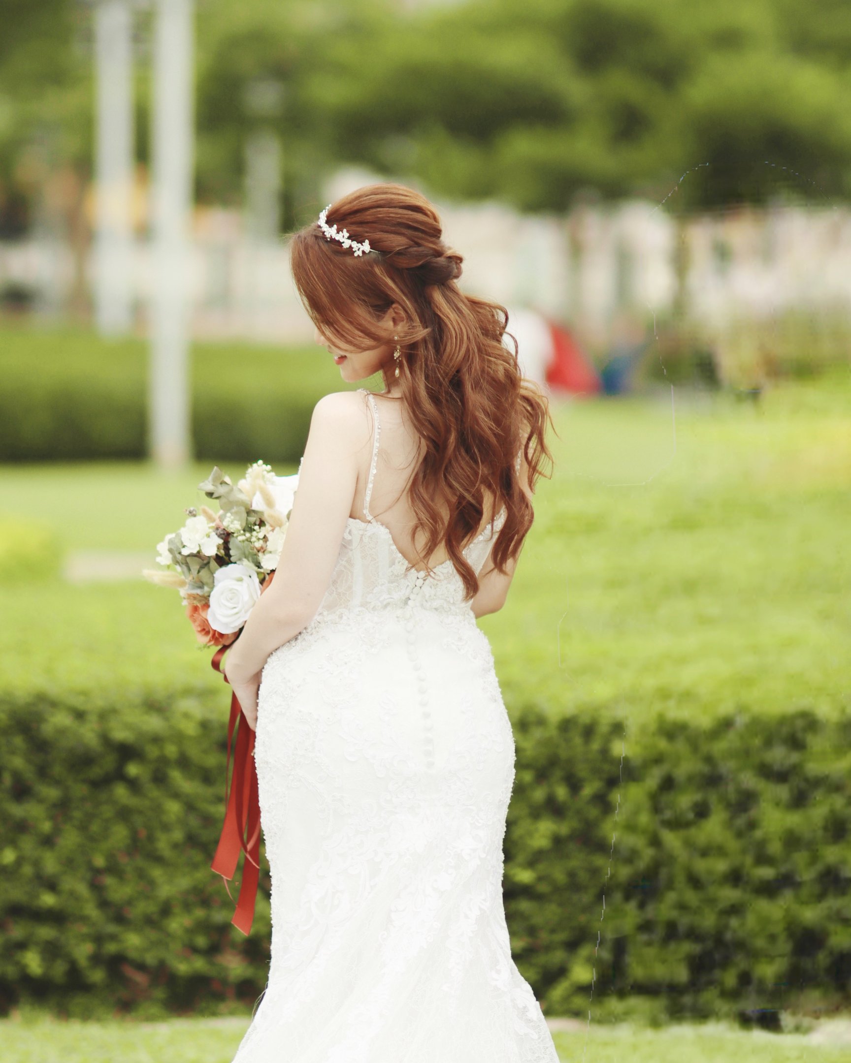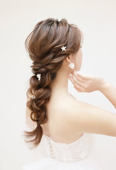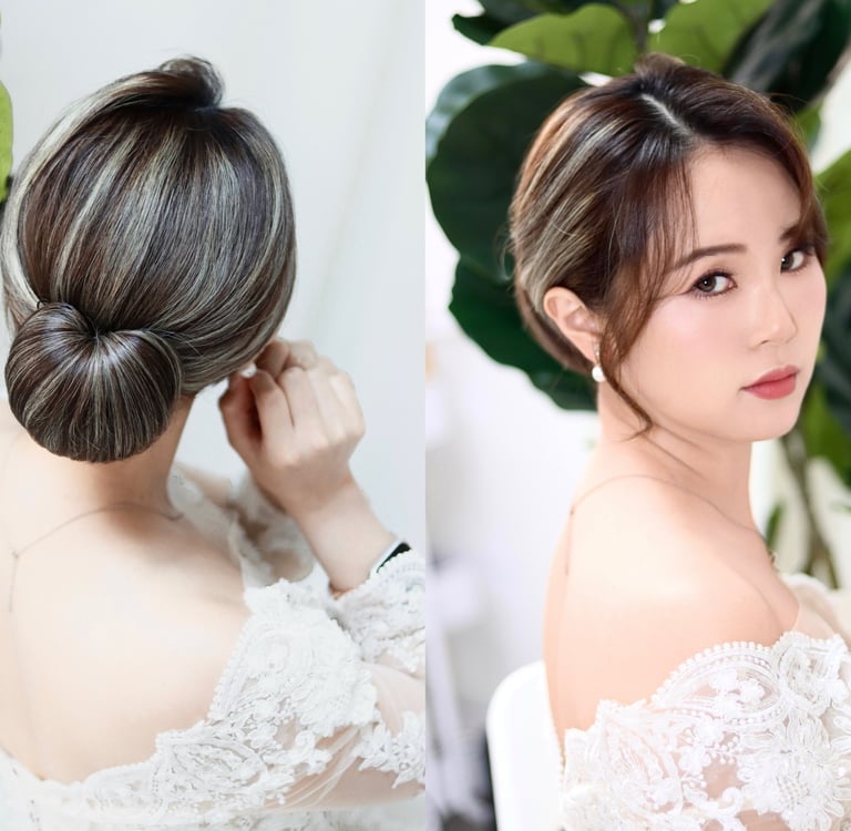 對於長度唔夠嘅頭髮,化妝師會選擇用假髮片,大概效果可以參考以下圖片,如果到bigday頭髮都係唔長,建議染棕/啡髮色,因為市面上嘅假髮片多數係棕/啡色為主,其次修剪髮尾層次,可以更好地融合假髮片。