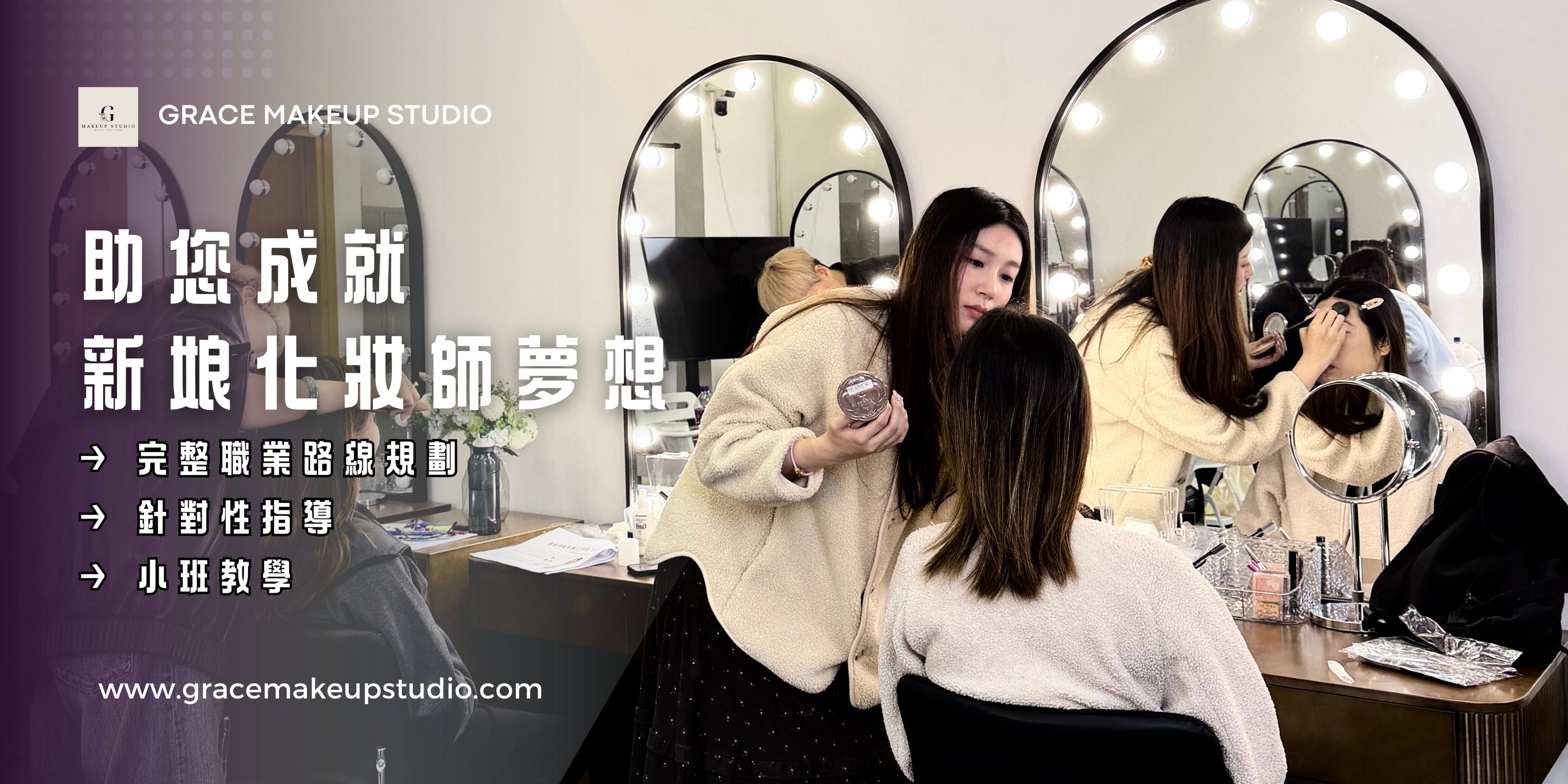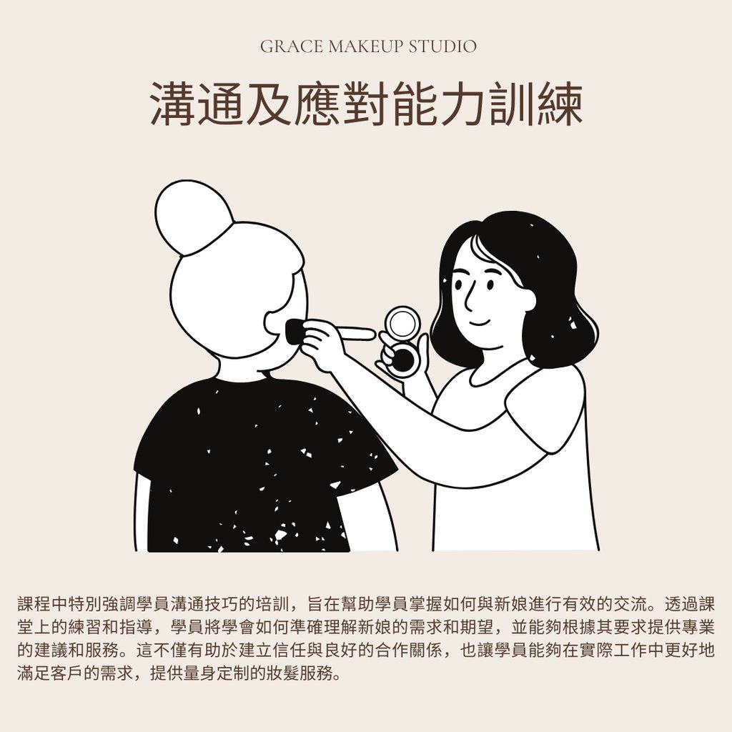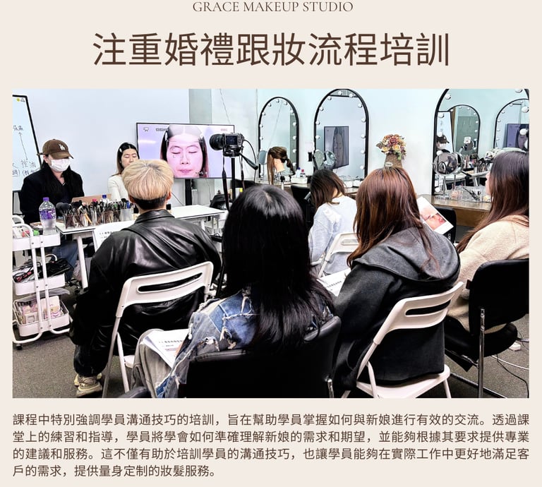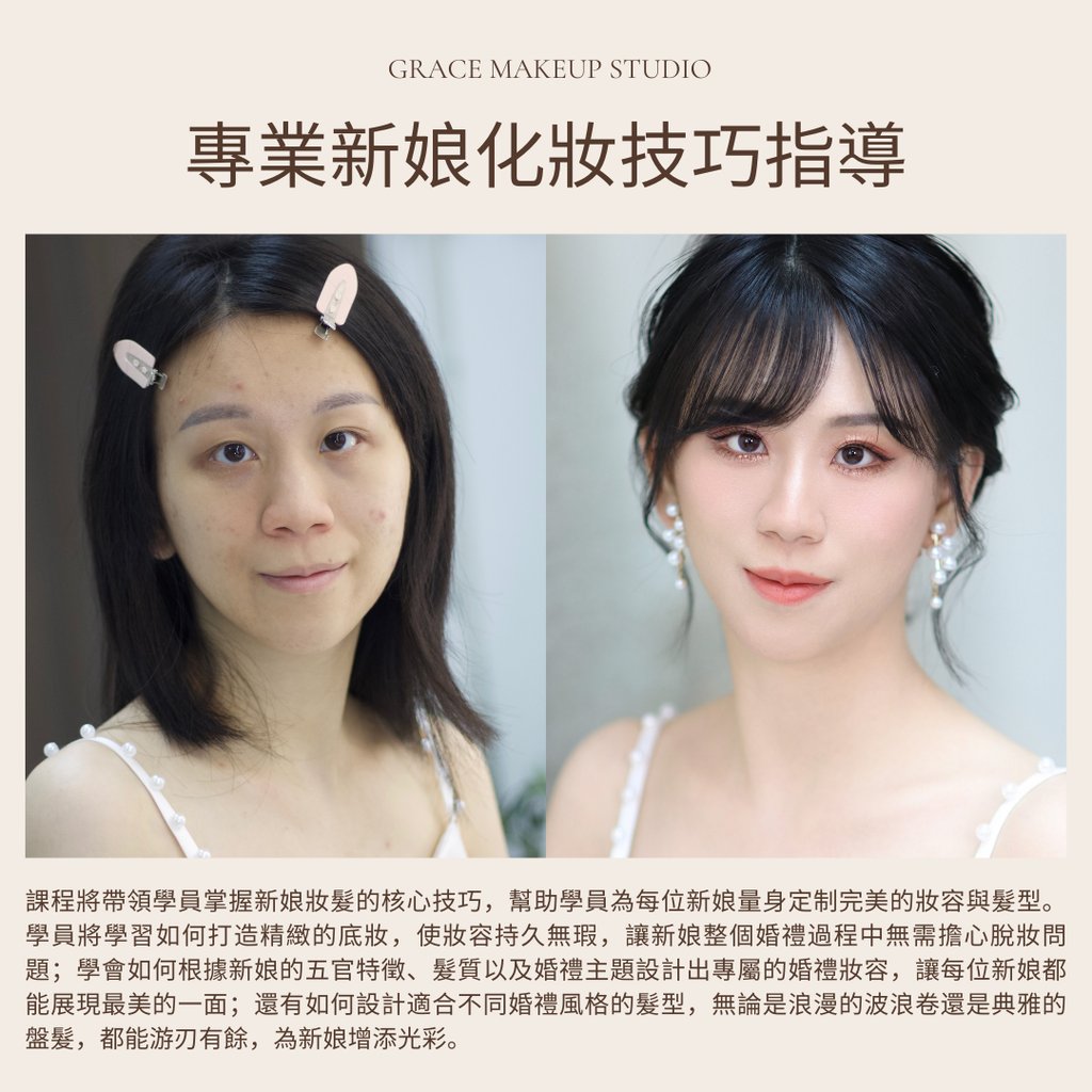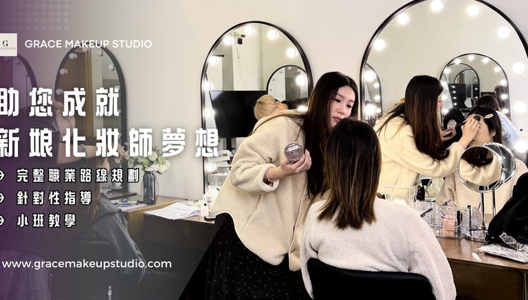 GRACE MAKEUP STUDIO全新推出專業新娘化妝培訓課程,旨在為有志投身婚禮化妝行業的學員提供一站式學習體驗。本課程精心整合基礎與高階化妝技巧,無需分開報讀多個課程,有效降低經濟負擔,幫助學員迅速掌握專業技能,快速進入新娘化妝行業。課程由經驗豐富的在職新娘化妝師親授,結合真實婚禮案例,系統教授婚禮化妝及跟妝流程。課程內容涵蓋專業化妝技巧、色彩搭配、新娘妝容與髮型設計,以及婚禮現場跟妝與補妝技巧。此外,表現優異者更有機會獲得有薪工作機會,確保理論與實務並重,助力學員在短時間內成為具備競爭力的專業新娘化妝師,開啟成功職業生涯。