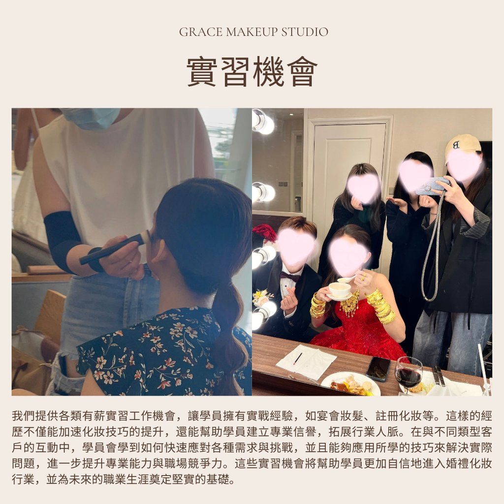 我們致力於培養專業化妝師,表現優異者有機會成為GRACE MAKEUP STUDIO的正式團隊化妝師,獲得有薪工作機會,參與婚禮化妝、廣告拍攝、寫真拍攝及宴會化妝等多元項目,開啟穩定且多面向的職業生涯。我們目標是助力學員從實習到就業無縫銜接,成為行業中備受推崇的專業化妝師。
