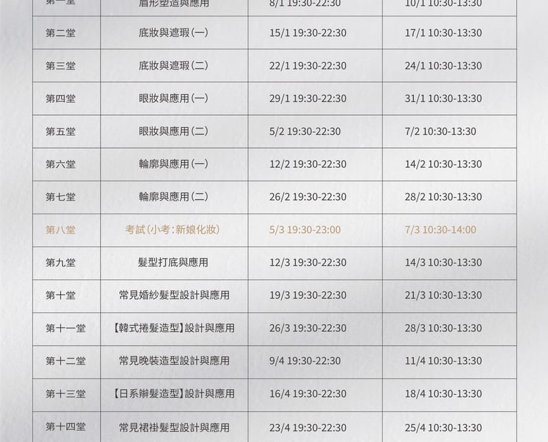 課程將帶領學員掌握新娘妝髮的核心技巧,幫助學員為每位新娘量身定制完美的妝容與髮型。學員將學習如何打造精緻的底妝,使妝容持久無瑕,讓新娘整個婚禮過程中無需擔心脫妝問題;學會如何根據新娘的五官特徵、髮質以及婚禮主題設計出專屬的婚禮妝容,讓每位新娘都能展現最美的一面;還有如何設計適合不同婚禮風格的髮型,無論是浪漫的波浪卷還是典雅的盤髮,都能游刃有餘,為新娘增添光彩。