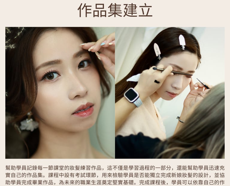 幫助學員記錄妝髮練習作品,這不僅是學習過程的一部分,還能幫助學員迅速充實自己的作品集。課程中設有考試環節,用來檢驗學員是否能獨立完成新娘妝髮的設計,並協助學員完成畢業作品,為未來的職業生涯奠定堅實基礎。完成課程後,學員可以依靠自己的作品集快速接單,開始自己的化妝師職業生涯。