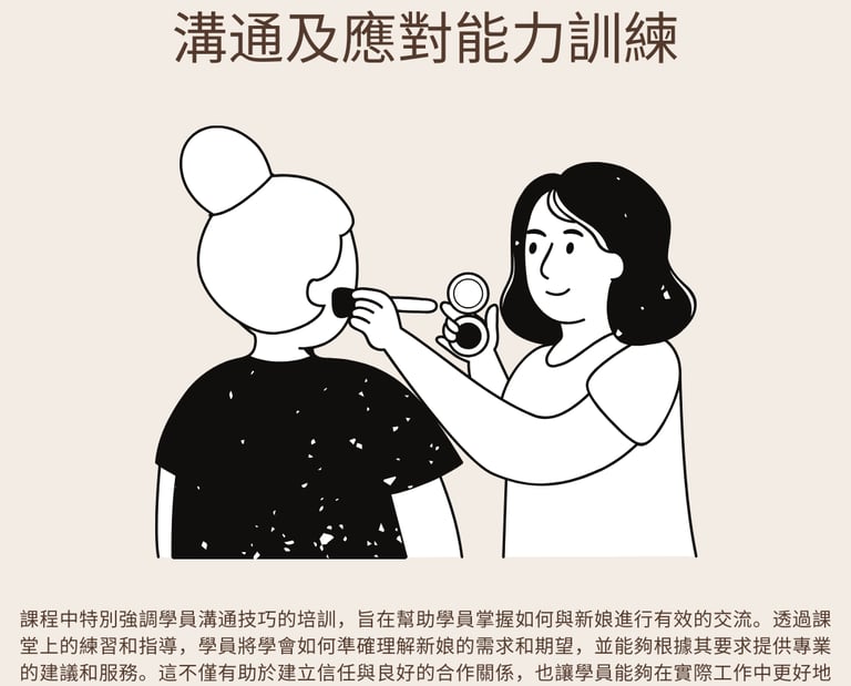 課程中特別強調學員溝通技巧的培訓,旨在幫助學員掌握如何與新娘進行有效的交流。透過課堂上的練習和指導,學員將學會如何準確理解新娘的需求和期望,並能夠根據其要求提供專業的建議和服務。這不僅有助於培訓學員的溝通技巧,也讓學員能夠在實際工作中更好地滿足客戶的需求,提供量身定制的妝髮服務。