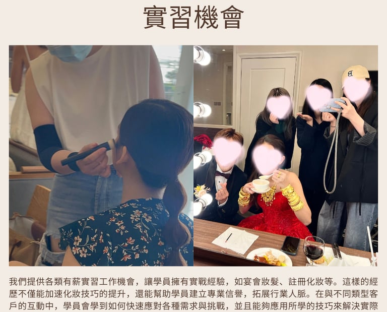 我們提供各類有薪工作機會,成績優異學員有機會獲得實戰經驗,如宴會妝髮、註冊化妝等。這樣的經歷不僅能加速化妝技巧的提升,還能幫助學員建立專業信譽,拓展行業人脈。在與不同類型客戶的互動中,學員會學到如何快速應對各種需求與挑戰,並且能夠應用所學的技巧來解決實際問題,進一步提升專業能力與職場競爭力。這些機會將幫助學員更加自信地進入婚禮化妝行業,並為未來的職業生涯奠定堅實的基礎。